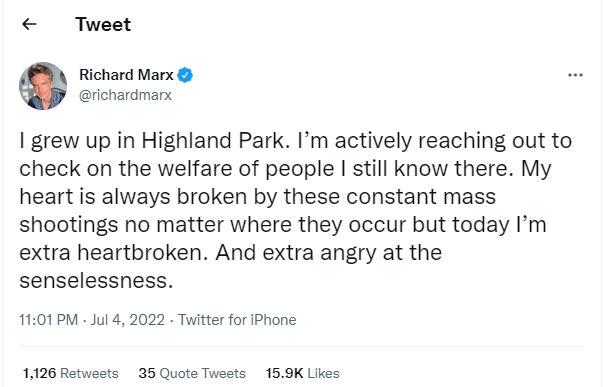 Condemning the shooting, Marx tweeted that he grew up in Highland Park as well and used his social media accounts “to check on the welfare of people I still know there”.