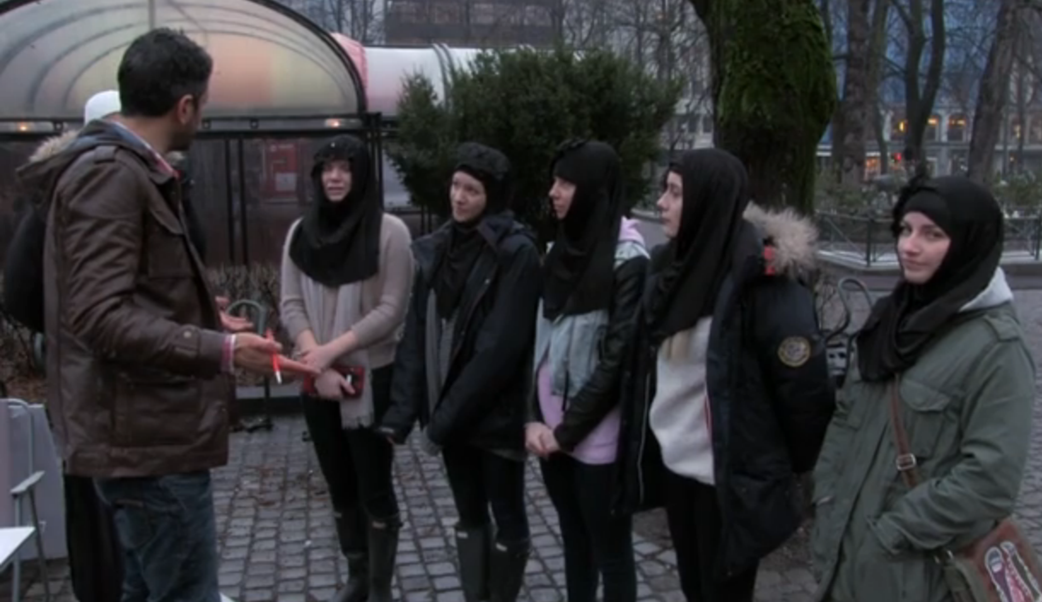 Five teenage girls were seen to agree to convert to the religion in the sketch on comedy show Ann-Kat Hærland. Two apparently Muslim men asked the girls to remove their makeup, put on hijabs and read what was alleged to be an Islamic creed in Arabic, before repeating a statement that said: “Justin Bieber is impure and probably gay.”