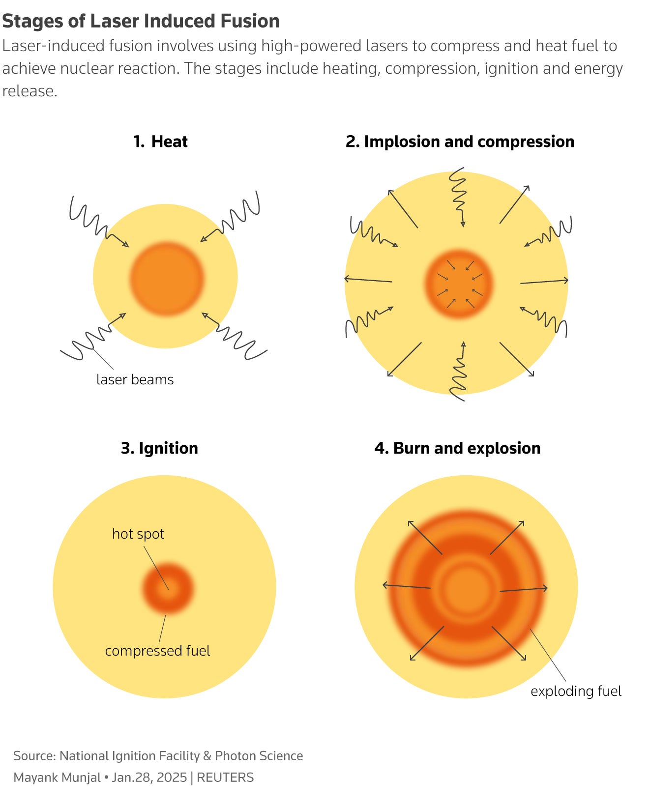 It is a similar layout to the $3.5 billion U.S. National Ignition Facility (NIF) in Northern California, which in 2022 generated more energy from a fusion reaction than the lasers pumped into the target - “scientific breakeven”.