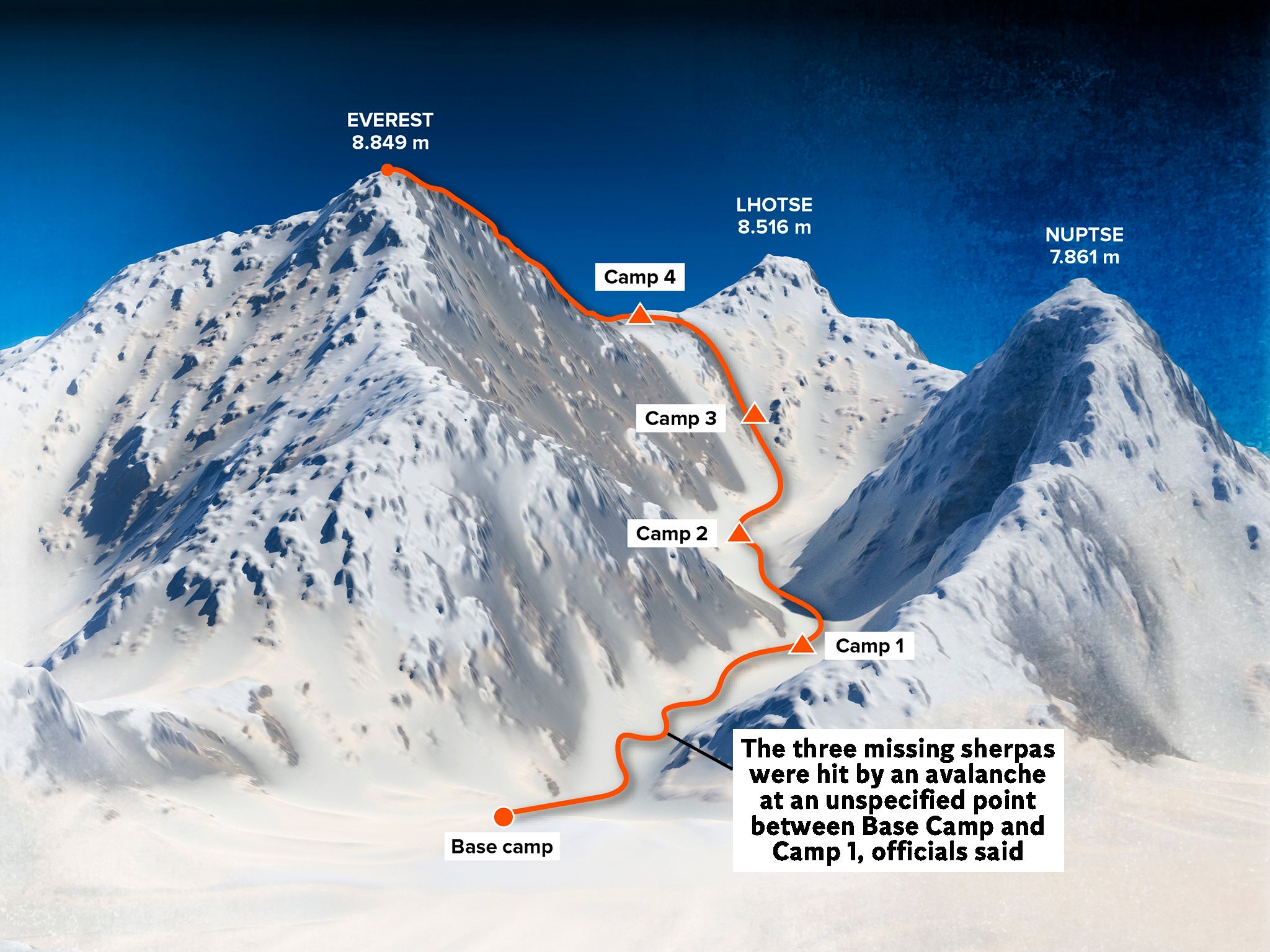 The sherpas are believed to be buried in a 50m (164ft) crevasse after the avalanche hit the most popular Southeast Ridge route to the summit of what is said to be the world’s tallest mountain.