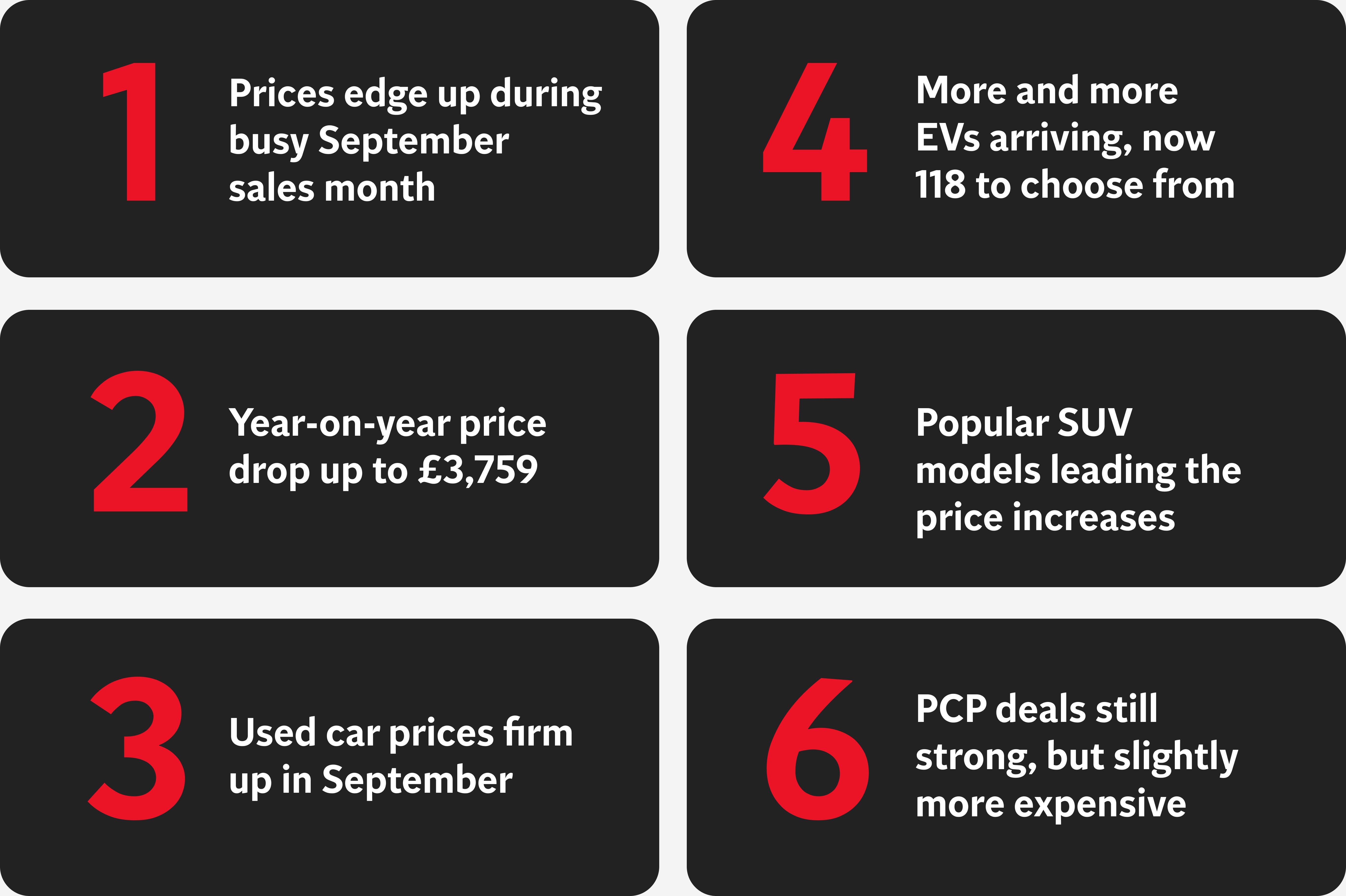- Keep an eye on finance terms. Car makers are quick to change deals and will turn the taps on if demand is weak – meaning better deals – or turn them off if demand is stronger, as we’ve seen in September.