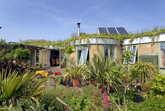 A five-bedroom, earth-sheltered self-heating home – they say the back-up heating system only needed to be switched on six times last year. It has an attached self-heating office. Hot water is provided by solar panels. Where is the wow factor?