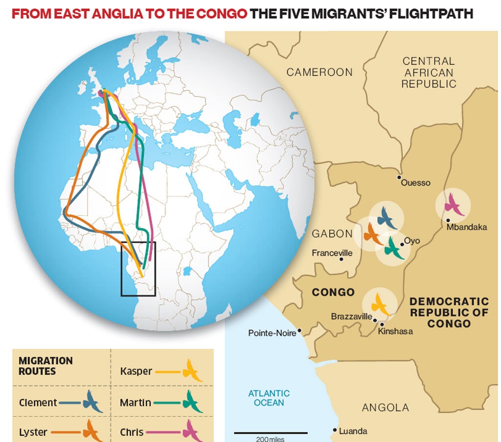 The five birds, named by researchers as Clement, Martin, Lyster, Kasper and Chris, have been separated on occasions by thousands of miles during their great odysseys, but to the amazement of researchers from the British Trust for Ornithology, they have now all recongregated in the same, little-known part of the continent – the Congo river basin.