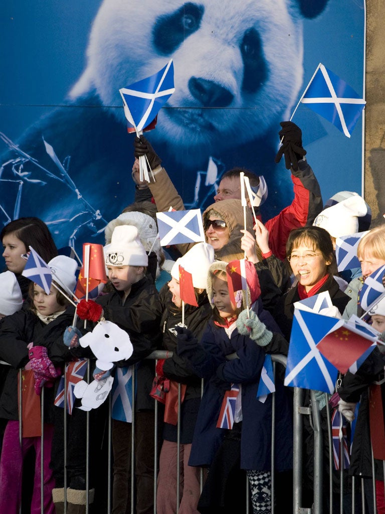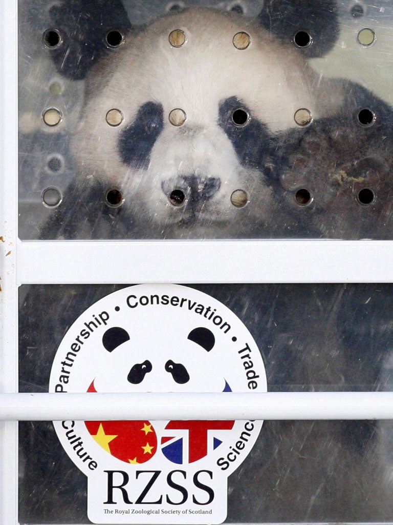 The flight crew was met by a delegation which included Scottish Secretary Michael Moore, Deputy First Minister Nicola Sturgeon and Edinburgh's Lord Provost George Grubb. The waiting media was given only a tantalising glimpse of the pair as they were unloaded in separate clear plastic cages in which they had made the nine-hour flight from Chengdu, close to the Ya'an reserve in Sichuan where they were born in 2003. They were then taken to the Royal Zoological Society of Scotland. Tian Tian (Sweetie) and Yang Guang (Sunlight) now have 10 years to do in Scotland what Ching Ching, Chia Chia and others spectacularly failed to achieve in London Zoo until 1994 – the last time a panda was on UK soil.