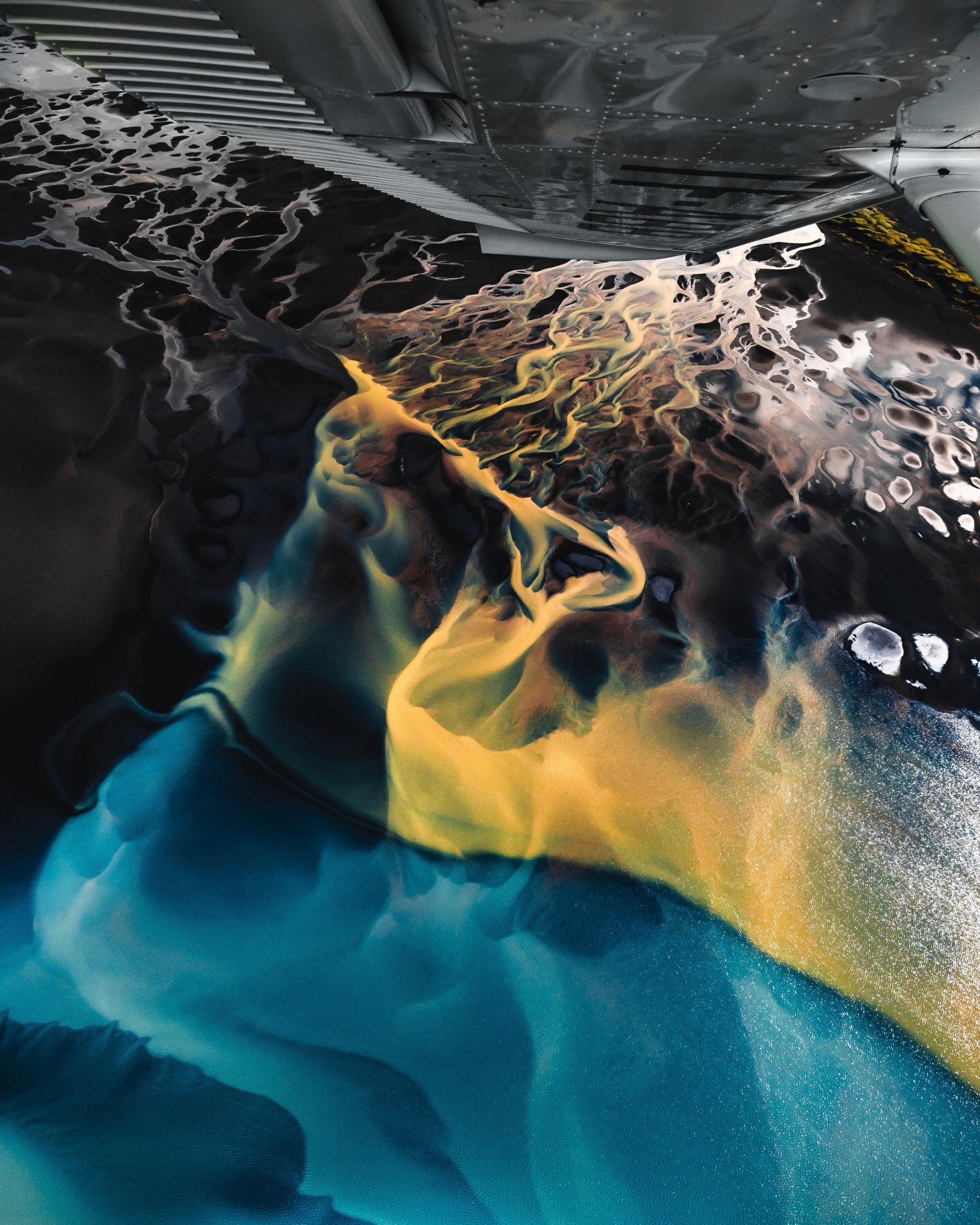 Spectacular photographs showing intricate patterns made by melting ice and glacial rivers wending through lush green hills in Iceland and Greenland have been captured from the air.