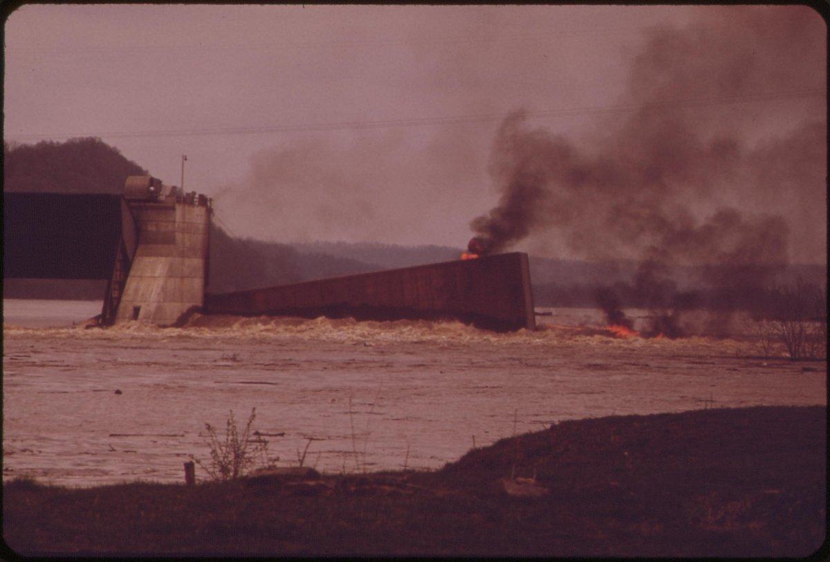 This photo shows a burning barge on the Ohio River in May 1972. A fire on the Cuyahoga River in 1969 (the 13th time that river had caught fire) helped to inspire the creation of the EPA
