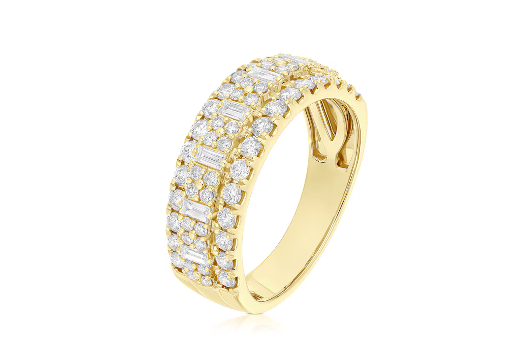 Bold and beautiful, this 14 carat yellow gold engagement ring from market leader Ernest Jones features three rows of baguette and round diamonds, weighing 1 carat. Perfectly chunky, the modern and chic ring is a stellar nod to Miley Cyrus’ style.