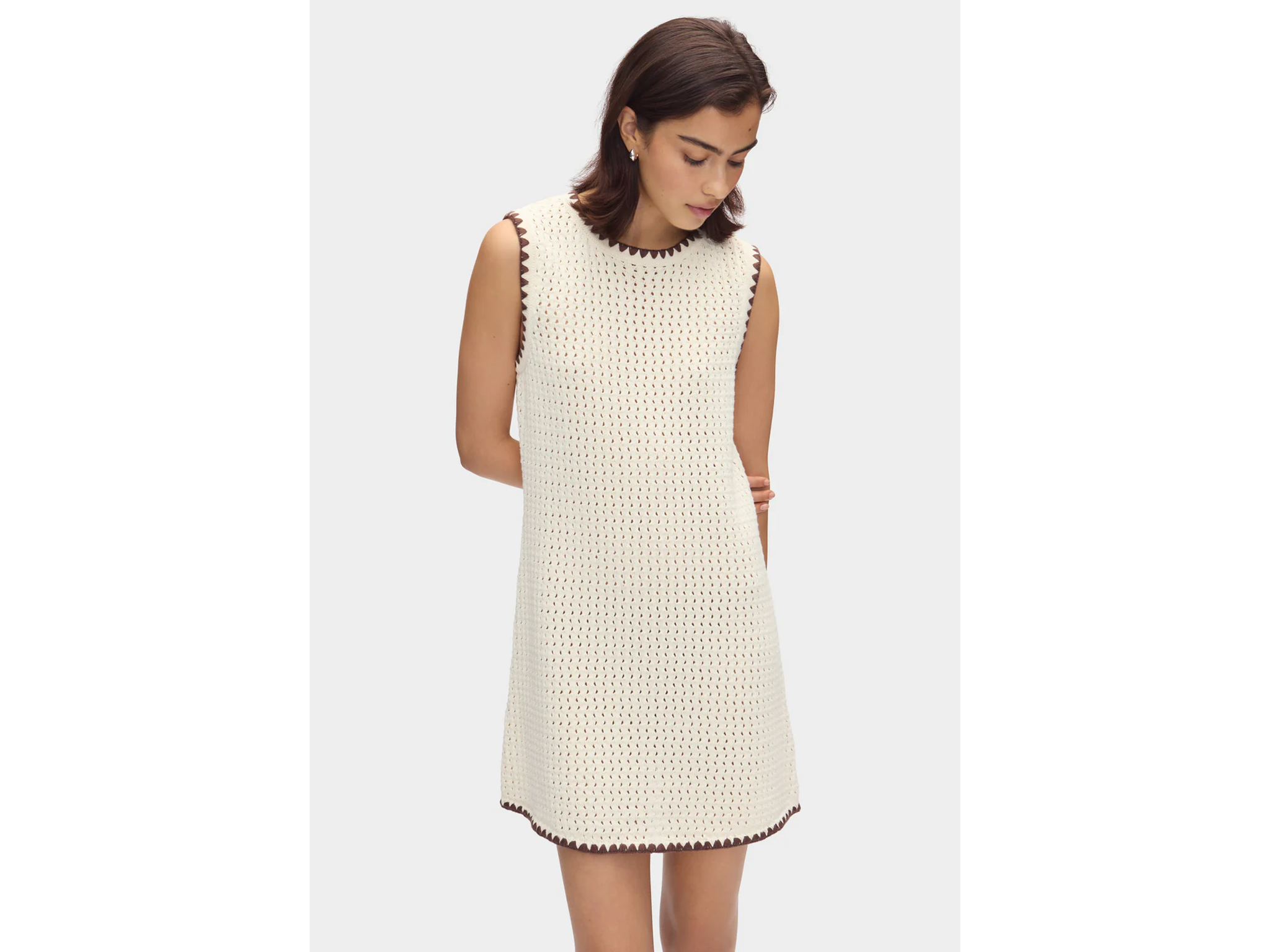 Lending itself well to Wimbledon, crochet is a perennially chic summer texture. This mini dress features contrasting brown stitch detailing along the seams, complete with a ribbed crew neckline and sleeveless design. Boasting a comfortable, relaxed cut, the dress is made from an organic cotton fabric for a lightweight feel. You can style with a scarf in your hair and loafers for a perfectly preppy look.