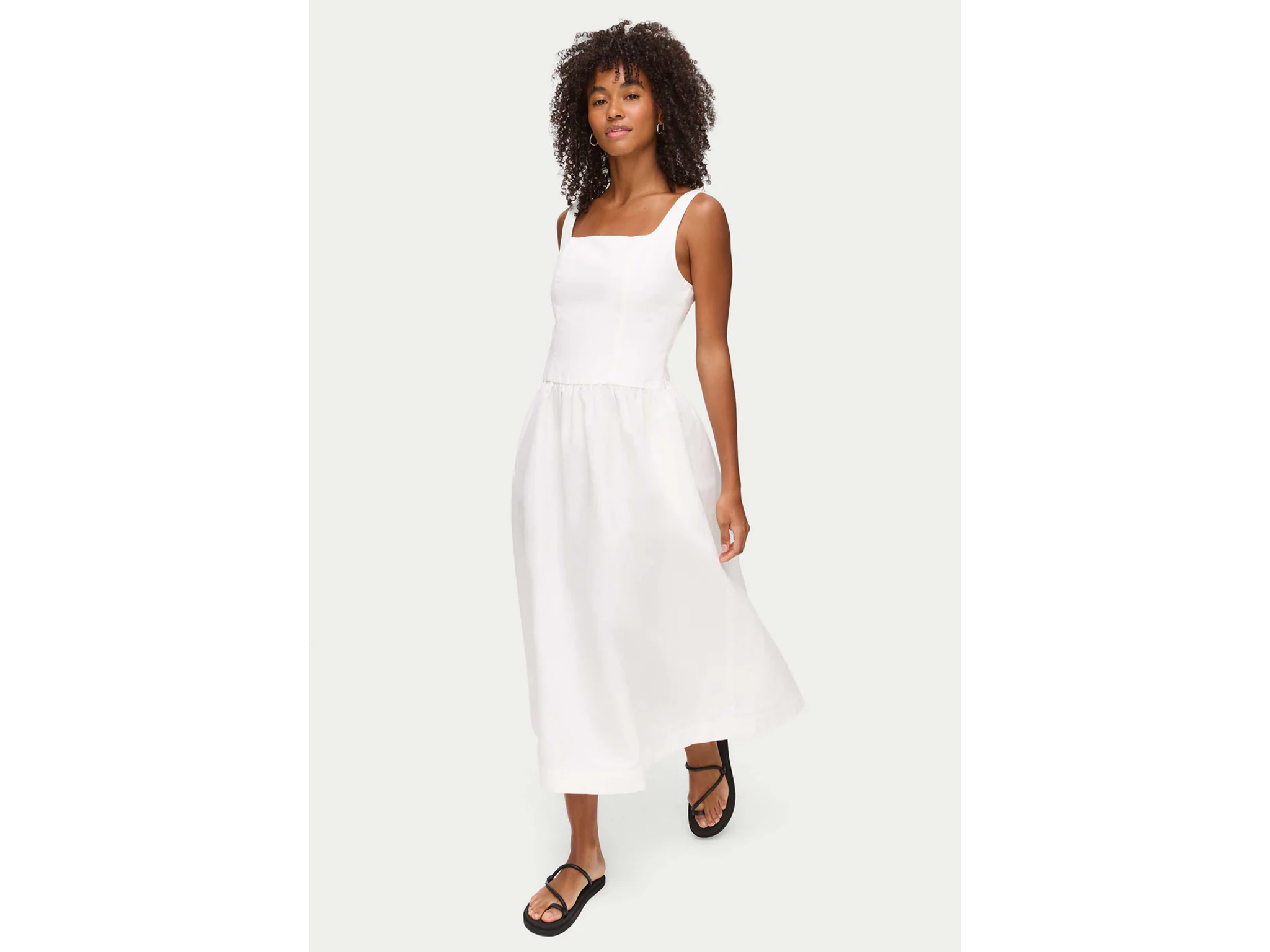 Available in Wimbledon white or minimalist black, Aligne’s Rosia dress is characterised by its on-trend drop waist silhouette. The fitted body flows down into a voluminous A-line midi skirt. Plus, the wide shoulder straps will easily conceal a bra.