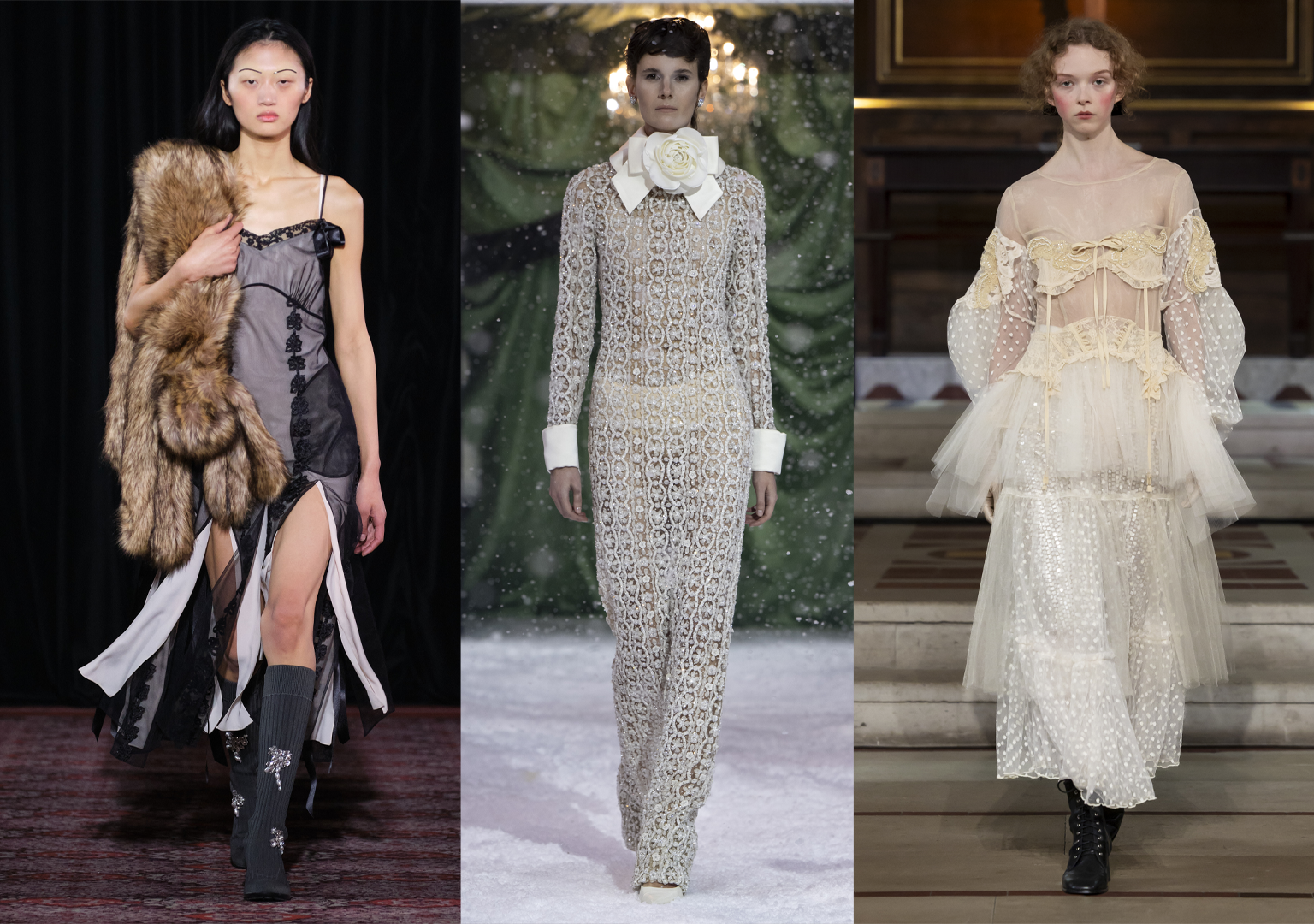 Whether layered at Bora Aksu, cut out at Simone Richa or draped at Jawara Alleyne, lace is set to return to our wardrobes come autumn. Richard Quinn used the romantic fabric in sheer, head-turning gowns while Simone Rocha featured lace panelling in her signature silky, slip dresses. Kate Moss’s favourite vintage supplier Annie’s Ibiza plumped for Renaissance-inspired lace sleeves and necklines, while Sinead Gorey took it back to basics with lace lingerie under a dramatic cape.