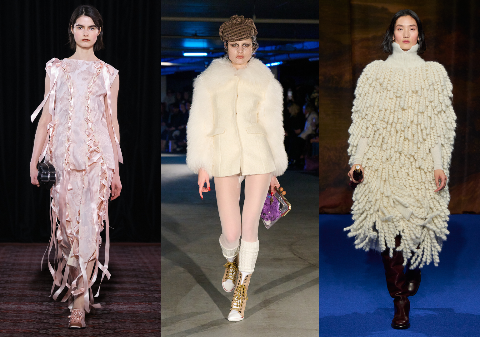 Elsewhere, Richard Quinn’s winter wonderland paid homage to London, with the snowy scene lit by street lamplights and models wearing Georgian gowns in a profusion of Fifties and Sixties haute couture silhouettes. As always, Simone Rocha’s A/W line was a blend of pieces born for both the runway and your wardrobe – think lace slip dresses, faux fur shawls, oversized cable knits and double-denim co-ords adorned with pearls.