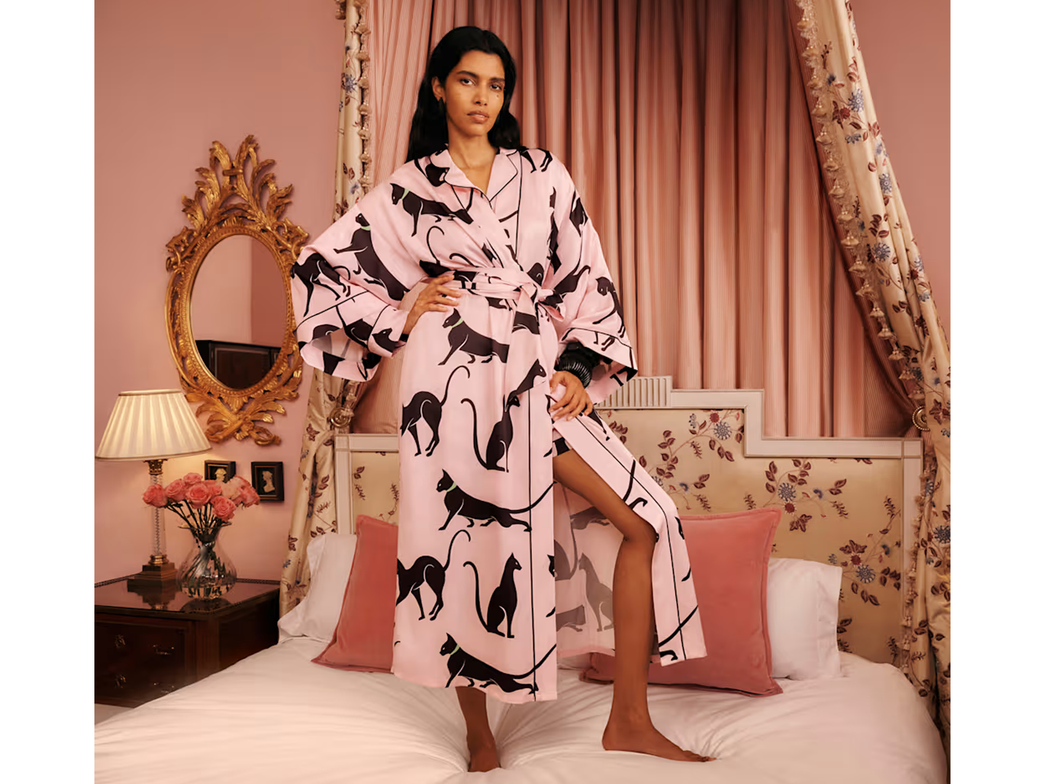 Matching the set above, the M&S x Olivia Von Halle wrap features the same bold cat print against a powder pink base. The feline motif is printed on a super-soft viscose fabric designed to drape beautifully, while the sash cinches the wrap in. In-keeping with the collection, it features the same deep cuffs and contrast piping.