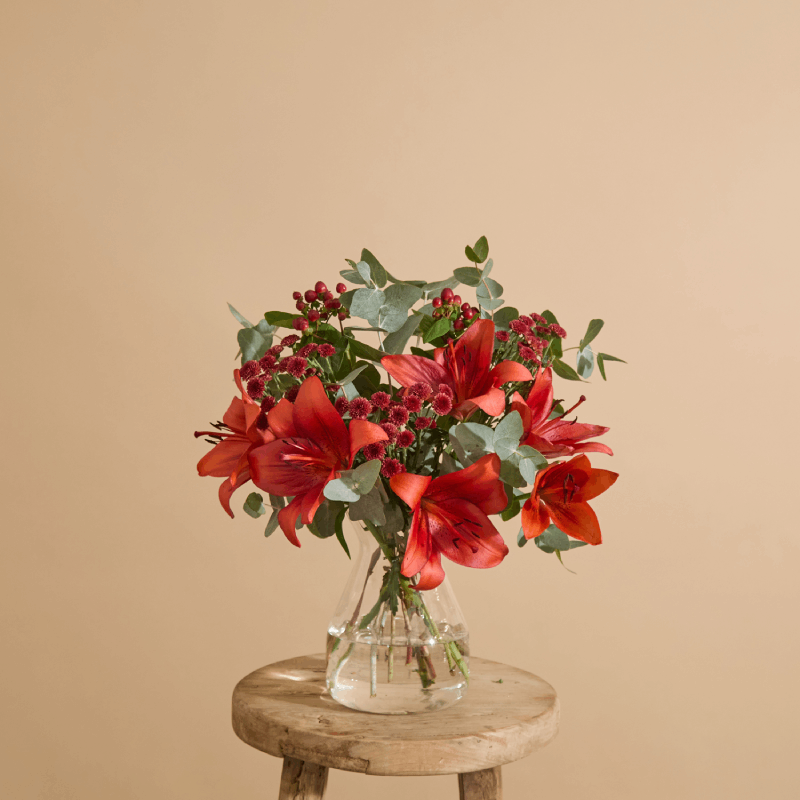 This boujie bouquet offers gift-giving ease. As the name suggests, the arrangement is inspired by luxurious silk pyjamas and it comprises LA lilies, eucalyptus and berried hypericum. The stylish combination of reds and greens exudes timeless Christmas glamour.