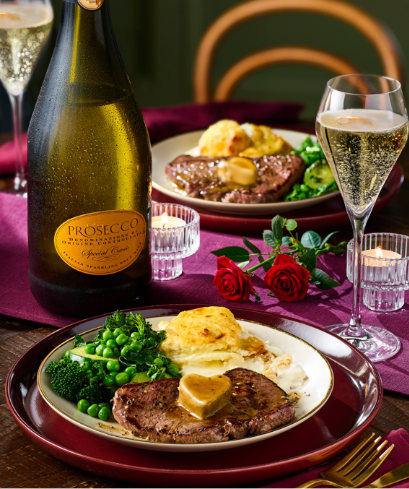 Lest we forget dessert. You can choose between a range of sweet treats, including chocolate and pistachio melt-in-the-middle pudding, lemon tart, sticky toffee pudding, profiteroles and more. Raise a glass to love with a prosecco or an alcohol-free sparkling rosé.