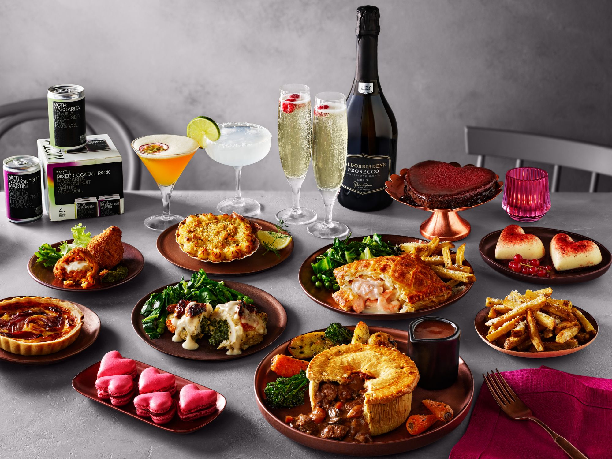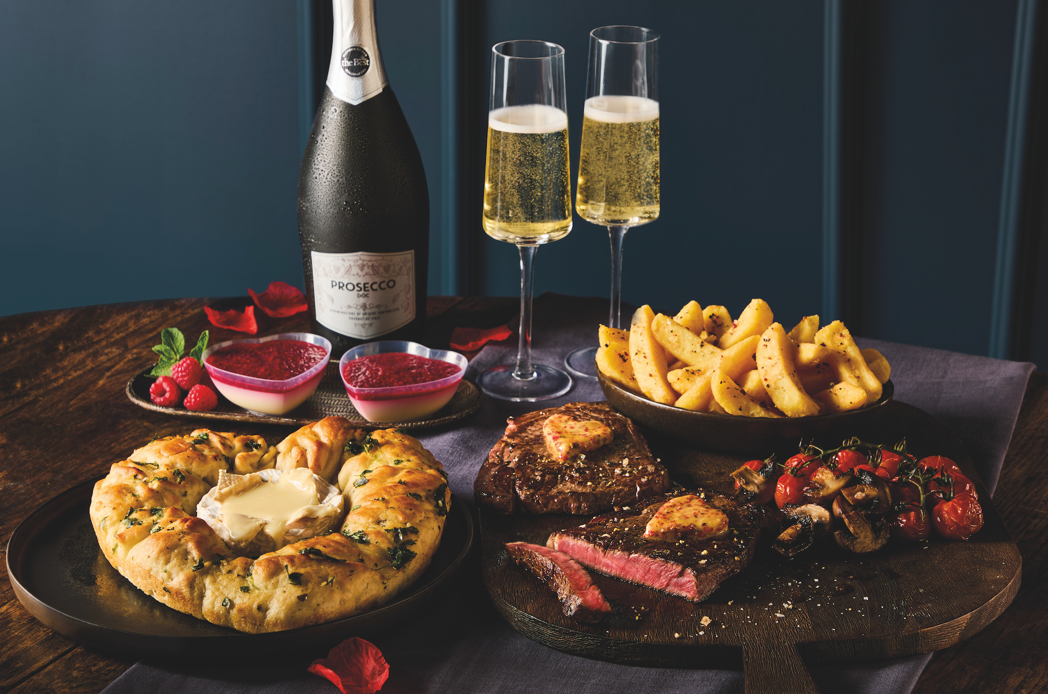 Every diner is catered for. The meal could begin with a prawn cocktail, a tear-and-share camembert heart-shaped wreath, or scotch eggs. For your main, serve up a rump steak with peppercorn butter, pulled beef lasagna, or a ‘marry me’ chicken, while for veggies, there’s a five cheese mac and cheese.