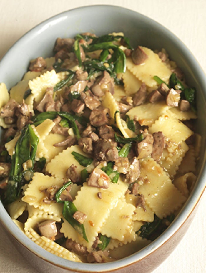 I've used a pasta here that is a bit like a chopped-up pappardelle. It's easy to eat and soaks up the rich sauce well. Chicken livers make a great base for a pasta sauce – they can be chopped as finely or as coarsely as you wish and here I've added wild garlic to give the pasta that seasonal touch. Wild garlic works perfectly in all sorts of pasta dishes as it naturally wilts into the sauce and you could even just use wild garlic, olive oil and butter to make a really simple and tasty pasta sauce.