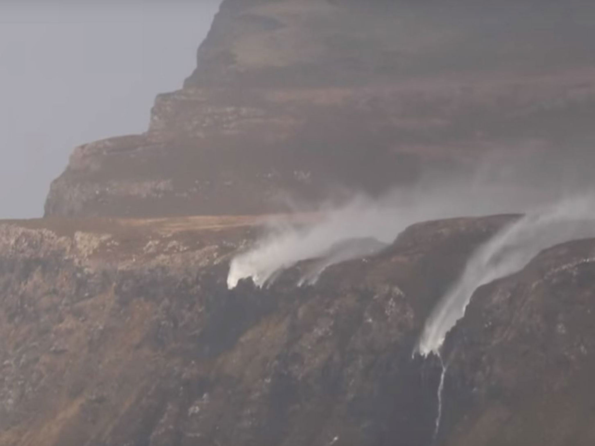 Online video showed waterfalls on the Isle of Mull being being blown "upside down", back uphill and 14m waves crashed along parts of the west coast of Scotland.
