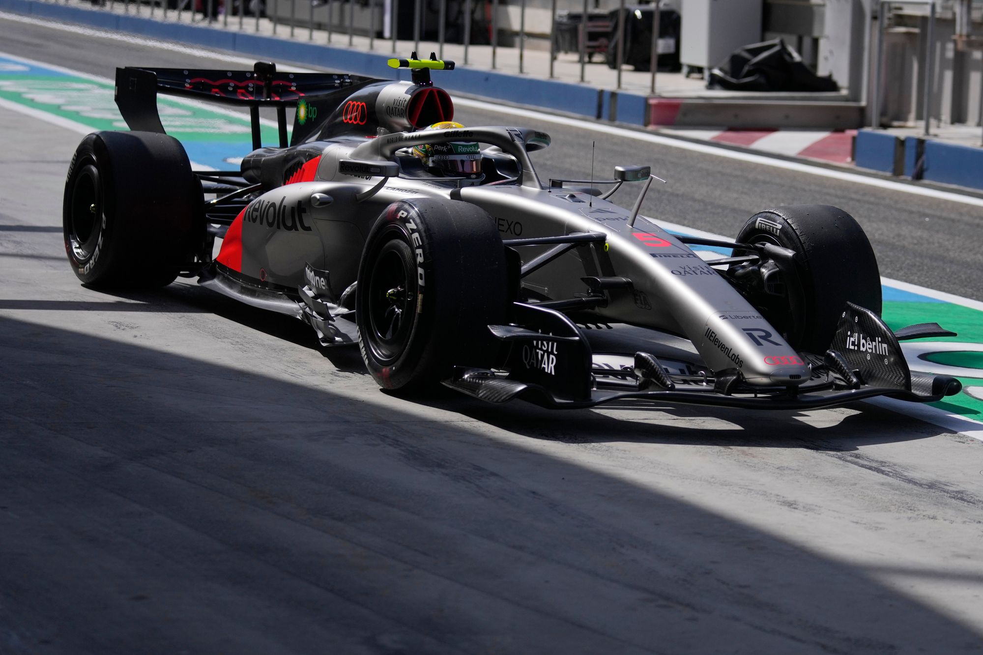 As soon as we get the green light in Bahrain, Max Verstappen heads out in his Red Bull. The four-time world champion is sporting some aero rakes as well