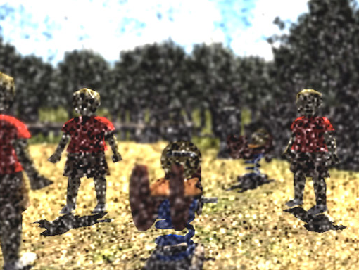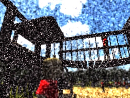 As I progress unsteadily across a playground rendered in gritty dots, I become aware of a shouting in the background that is getting louder as I walk on. The children I pass have blank faces and bright red T-shirts that hurt my eyes.