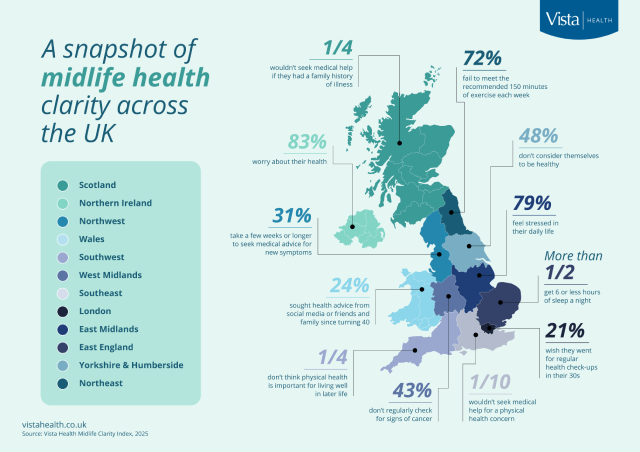 New research from Vista Health shows that many in this age group wish they had prioritised their health sooner. More than a quarter of those surveyed admitted to worrying about receiving a diagnosis after 40, while three in four said they feel concerned about their overall wellbeing.