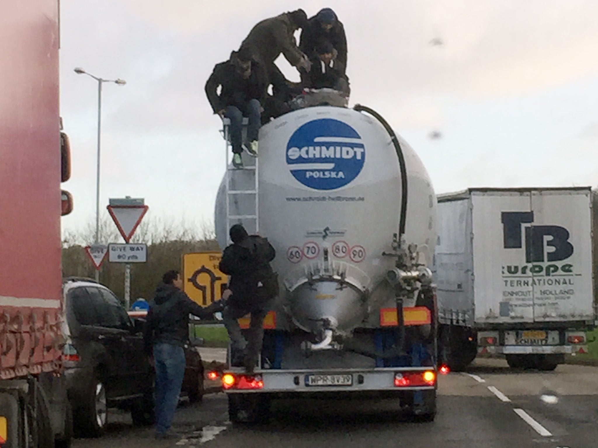 A group of men have been photographed climbing out and sitting on top of a tanker on a motorway in Kent.