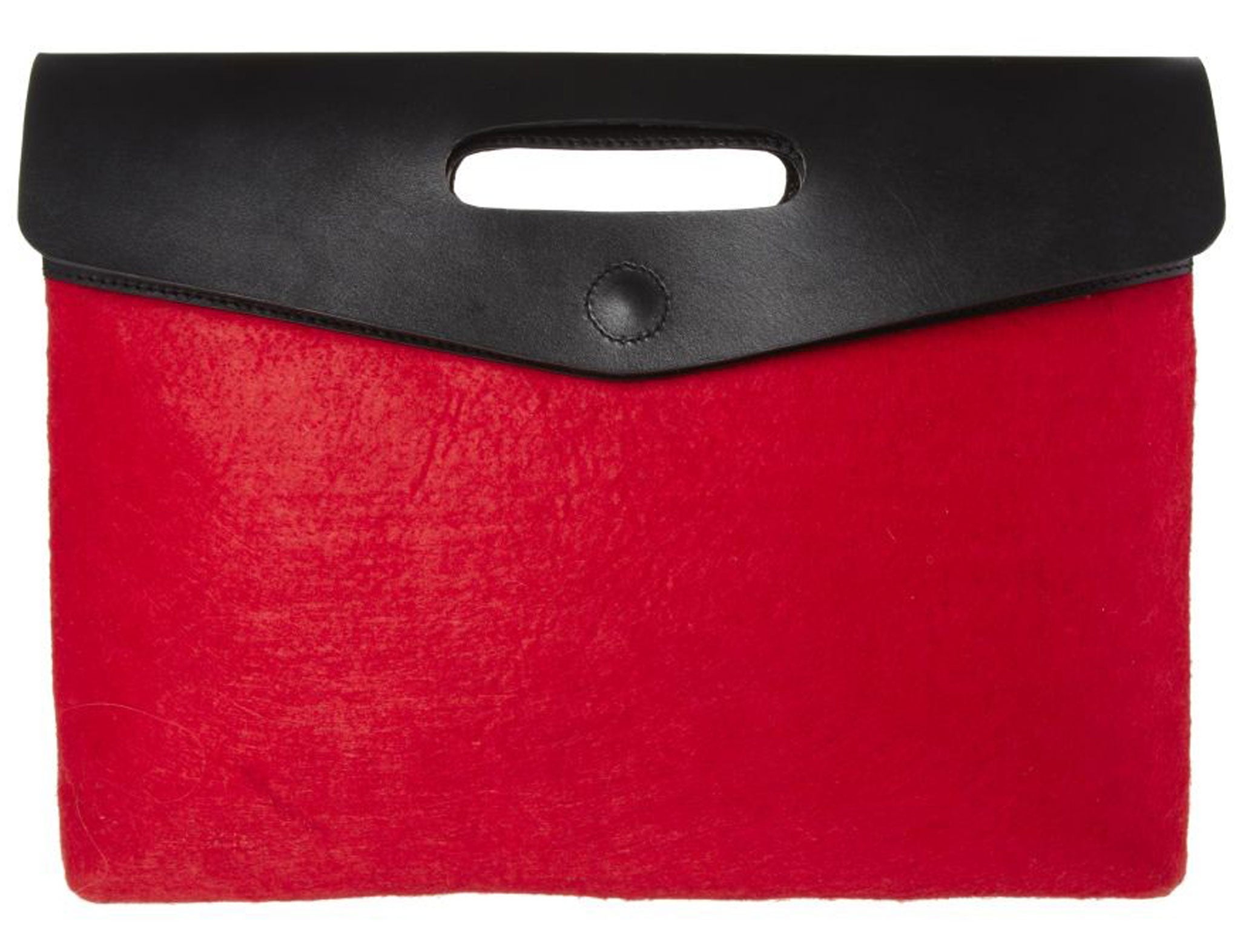 The classic colour pairing of red and black is updated here with a texture mix, thanks to a leather flap that contrasts with the felt of the main pocket. Flattened, oversized clutches are here to stay but the cut-out handle means you can also carry this.