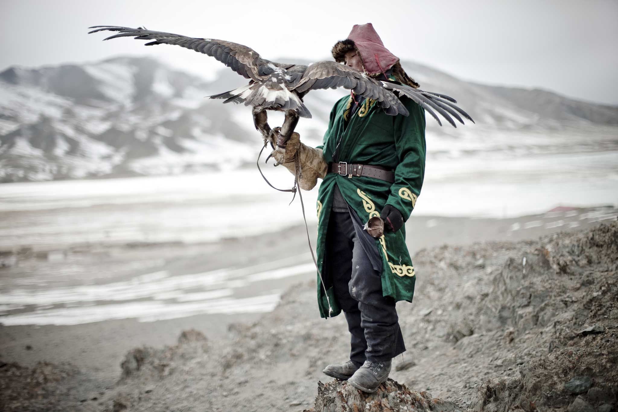 The Kazakh nomad's hand rocks forwards in a gentle stroking motion and the eagle needs no keener reminder of the business of the day, springing from her master's wrist like a fluid extension of his will, gaining the thin, freezing-cold upper air with a few strokes of her vast wings. From there she sees the province of Bayan-Olgii spread out below, the bare, dun-brown, ice-streaked mountains culminating in Mongolia's highest, Khuiten Uul, climbing 13,000ft into the sky.