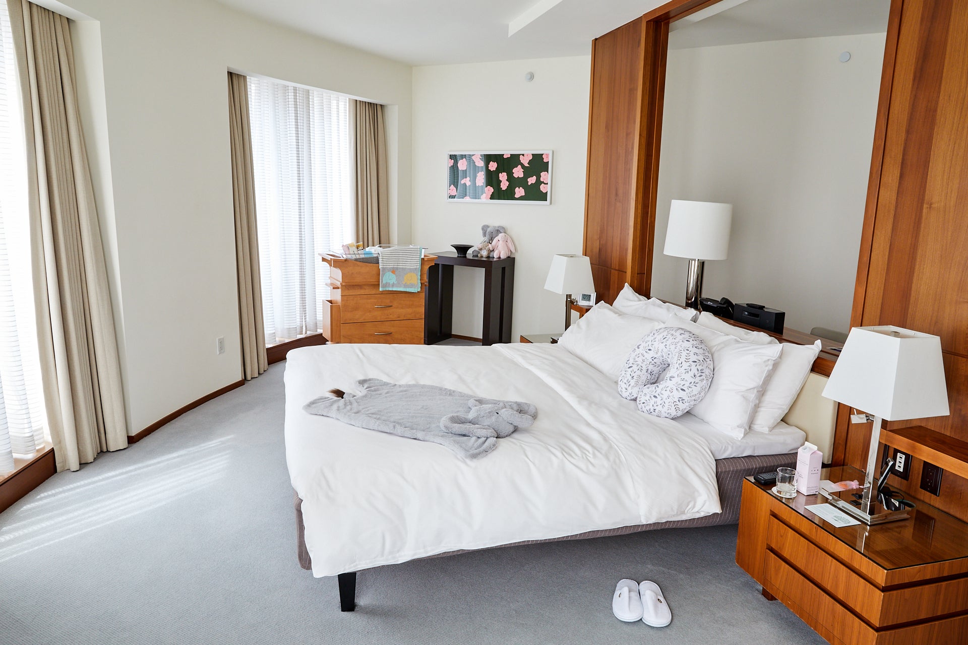 Boram Care takes up the top floor of the hotel, where standard hotel rooms are repurposed into a family-friendly environment. We arrived to an extra-large bed with a wheeled bassinet beside it, complete with a newborn swaddle and a pile of high-end diapers, wipes, and maternity pads. The bathroom, like all of those at Boram, have large walk-in showers (they used to have a mix of bathtubs and showers in Boram Care’s previous incarnation at another Manhattan hotel, but they changed to an all-shower layout at their new location after feedback from post-C-section moms who sometimes struggled to get into the baths.)