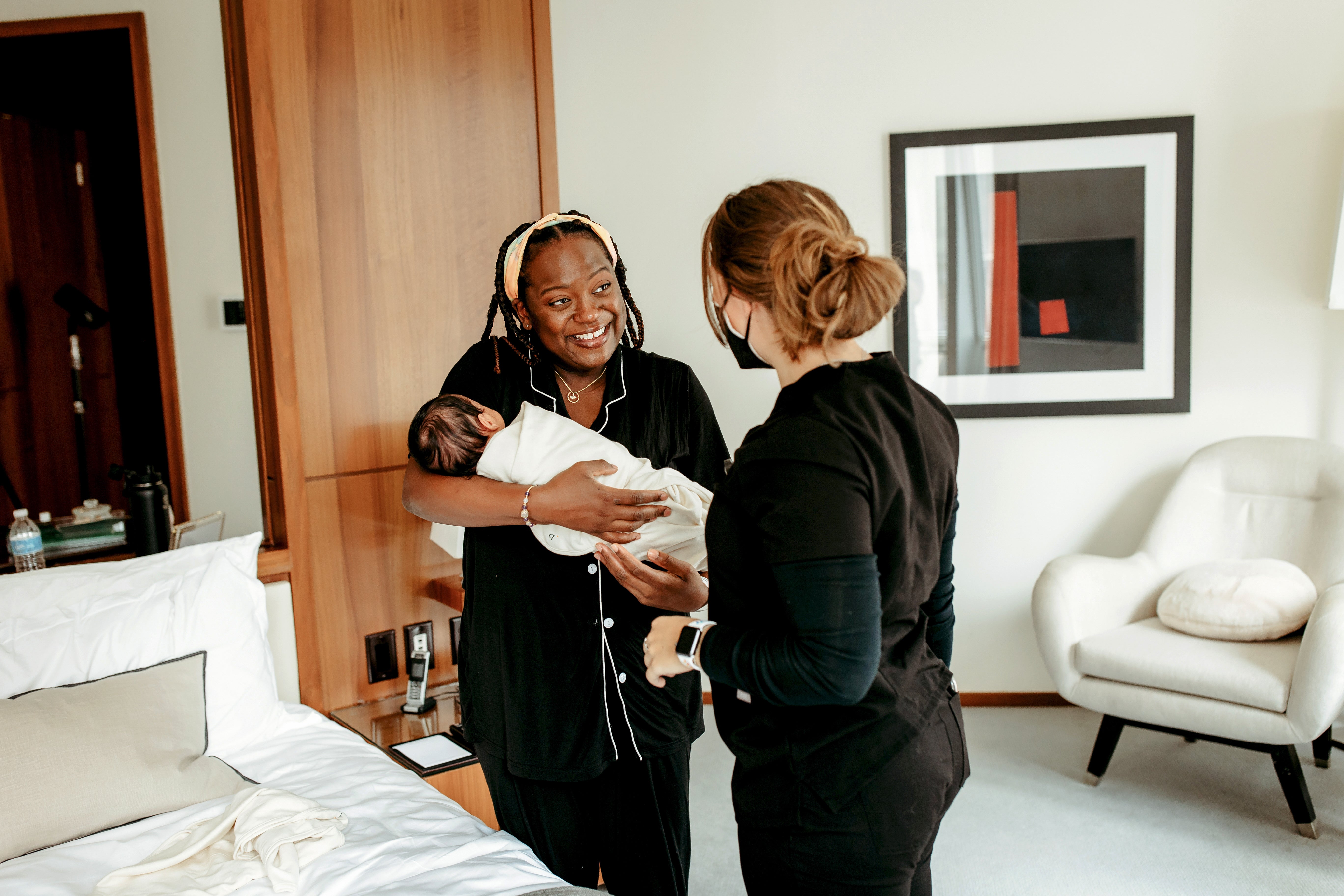 At one point, I turned to the baby nurse and asked: “Can you just rock him to sleep? I can’t work out how to get him into the bassinet.” She swaddled him, turned on a Spotify track of shushing noises, and rocked my baby until he went down. My husband and I then slept in a bed together for the first time since I’d given birth. And when we woke up, I was offered a foot bath or a massage.