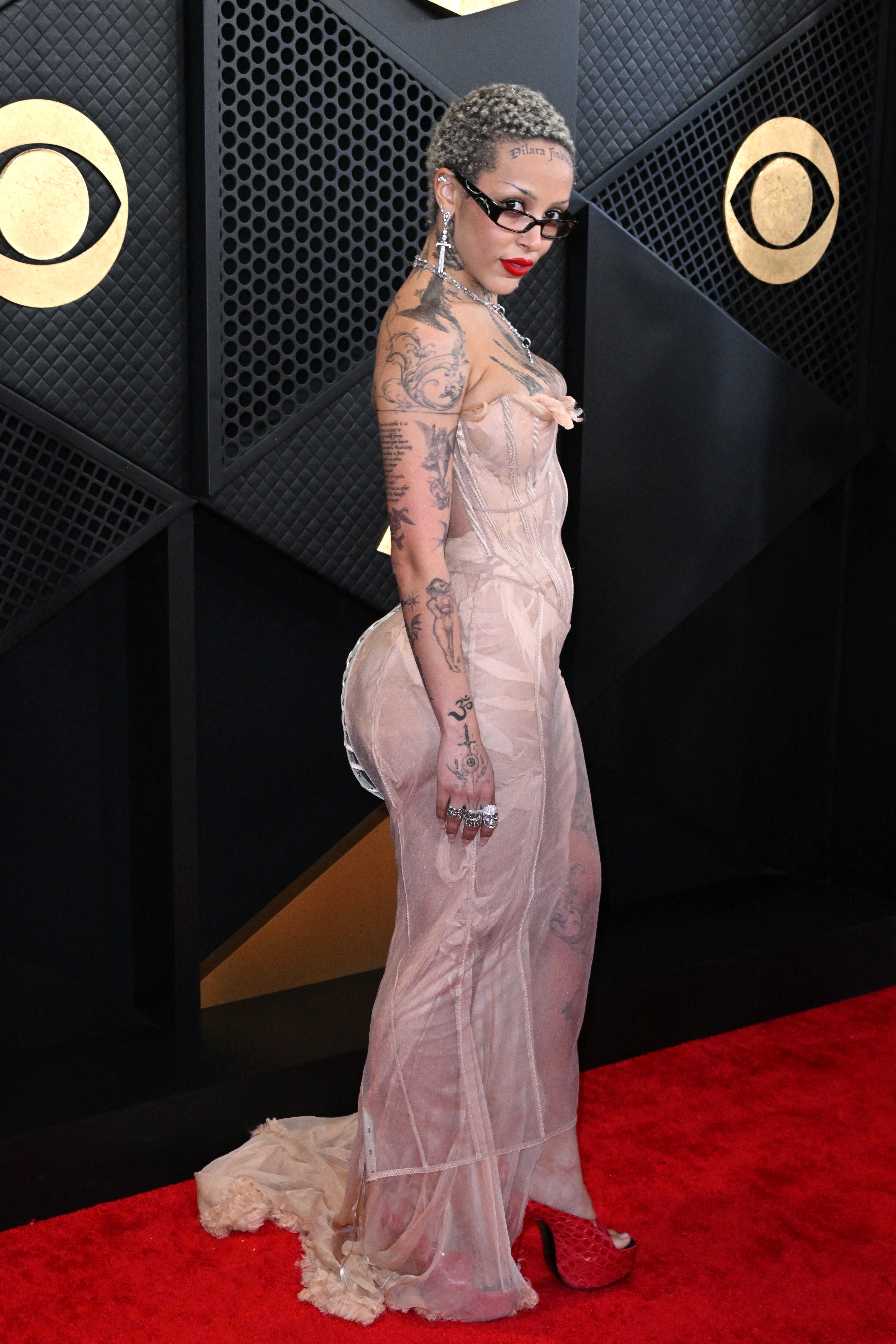 On Sunday 4 February, the 28-year-old “Woman” singer arrived on the red carpet outside of the Crypto.com Arena in Los Angeles, California, in a sheer corset gown by designer Dilara Findikoglu and glasses. The see-through nude dress bared Doja Cat’s chest, as well as multiple new tattoos, including the outline of a building.