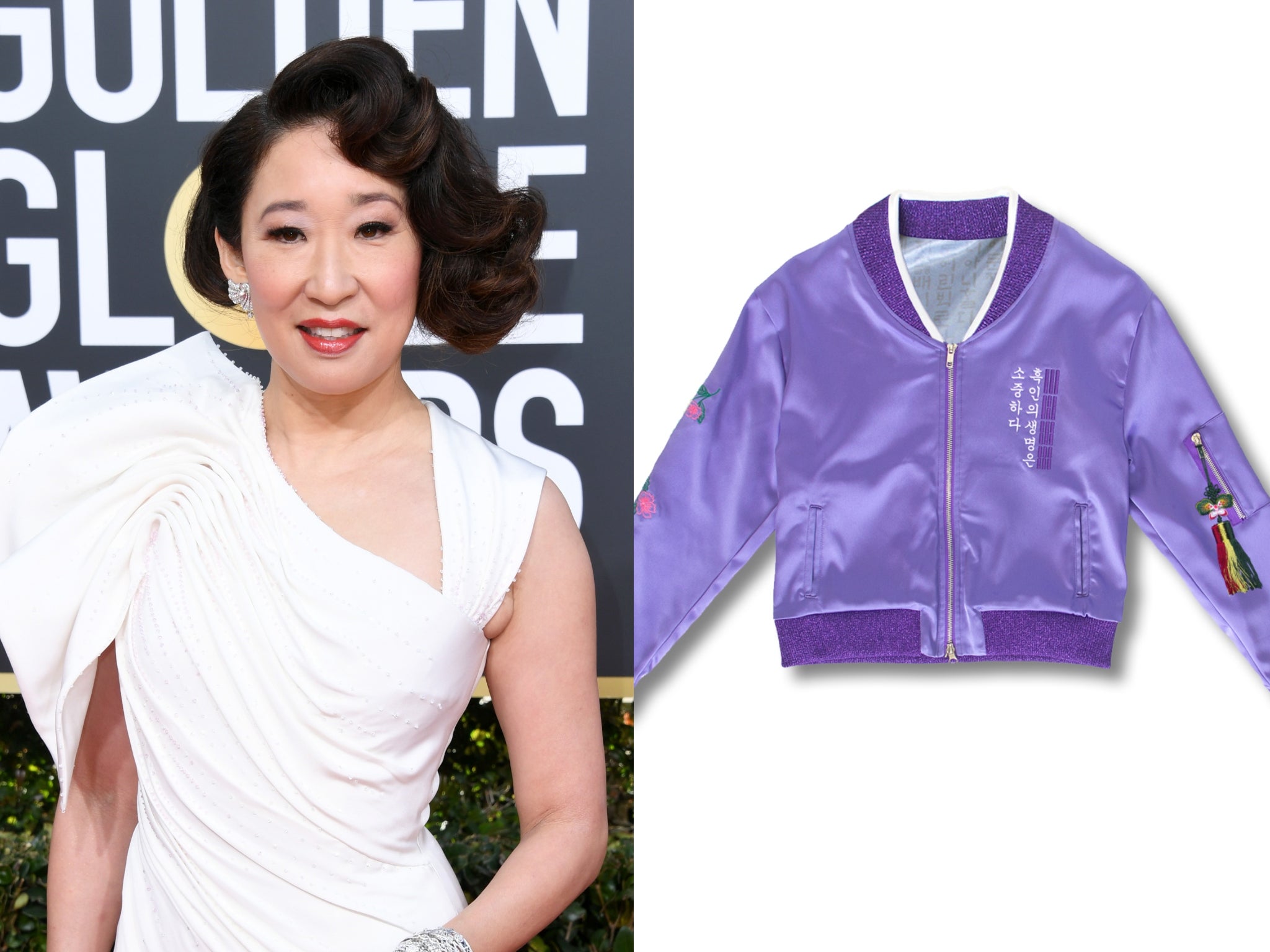 For the awards ceremony, which was held virtually for the first time due to the coronavirus pandemic – with nominees tuning in over video call from the comfort of their homes – Sandra Oh made a powerful statement with her outfit of choice, wearing a jacket embossed with a message in support of the Black Lives Matter movement.