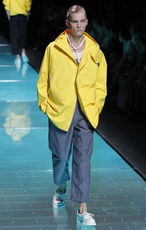The vogue for loud flashes of colour in menswear has been a long time in development, and, unusually, even managed to hit the mainstream over the past years. But there was a new set of tones in play, sickly but muted, and hovering between pastel and neon. Kind of like the shades you might see in a gelateria. In Milan, at the Z Zegna show, minimalist artist Dan Flavin (he of the coloured tube-lighting) inspired wonderful, almost over-exposed shades of mint green, coral and melon-like pale orange, and at Gucci, too, where creative director Frida Giannini proposed a series of loud, one-colour suits in supercharged pastel shades. Meanwhile in Paris, Hermès showed macs and track tops in a sickly lemon yellow and Raf Simons fielded bomber jackets in three different lengths and lollipop shades of pale pink, orange and vibrant cherry, while Yohji Yamamoto combined primary colours.