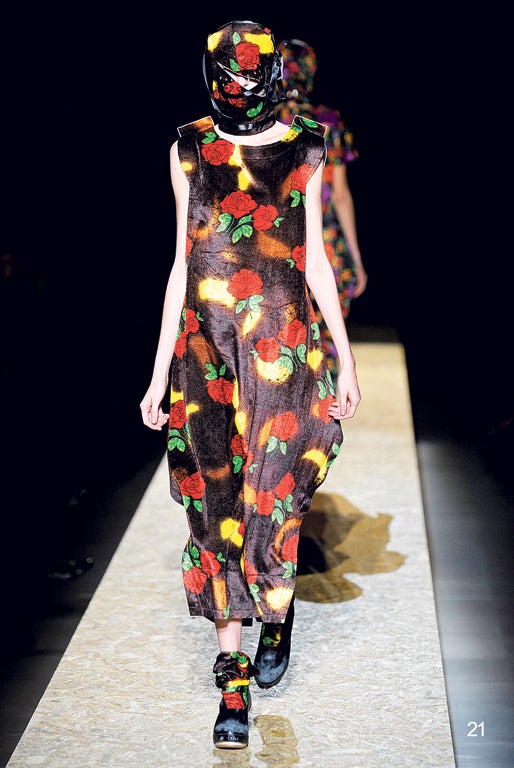 Kawakubo, meanwhile, inverted her previous season's silhouette by covering the face completely with a bondage-style balaclava that grew out of a bright floral body suit. The silhouette was constrictive but the character was warm and invulnerable. The thinly woven balaclavas pulled down over faces painted with a spirited flash of red lipstick at Rick Owens had a similar effect. His models strode out against an inferno; this was, he later asserted, a look he saw as completely wearable.