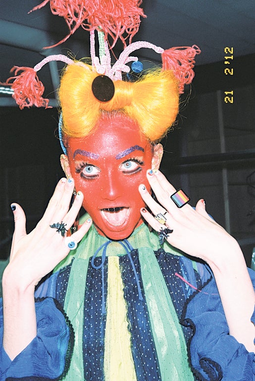 At Meadham Kirchhoff, designers Edward and Ben came to make-up artist Florrie White with a clear vision for their autumn winter show: 1990s supermodel meets 1980s drag queen. "It was gradual, as if the two were meeting each other," White says. As the old-school glamour and sculpted features of Christy Turlington entered a collision with Trojan, the drag queen at the heart of the Eighties club scene, a scrawl of paint around the eye grew into an hallucinogenic eye patch, a nude lip became a canvas for hyperactive pastel doodles. And those eyebrows? Lest any detail get lost in translation, each zig-zag was scrawled on by Edward.