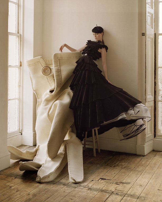 Giles Deacon's pleated silk "carwash" dress (2007) rubs shoulders with a body-conscious floor-length gown constructed out of loops of silver leather by Gareth Pugh especially for the show. Then there's Atsuko Kudo's fetishistic latex snakeskin-print dress to consider; a feathered design made by Sarah Burton for Alexander McQueen and worn by Daphne Guinness to the 2011 Costume Institute Ball; a Stella McCartney gown with a bifurcated skirt sported by Annette Bening to the Golden Globes and the Jacques Azagury ensemble chosen by Helen Mirren when she picked up the Oscar for Best Actress for her performance in The Queen.