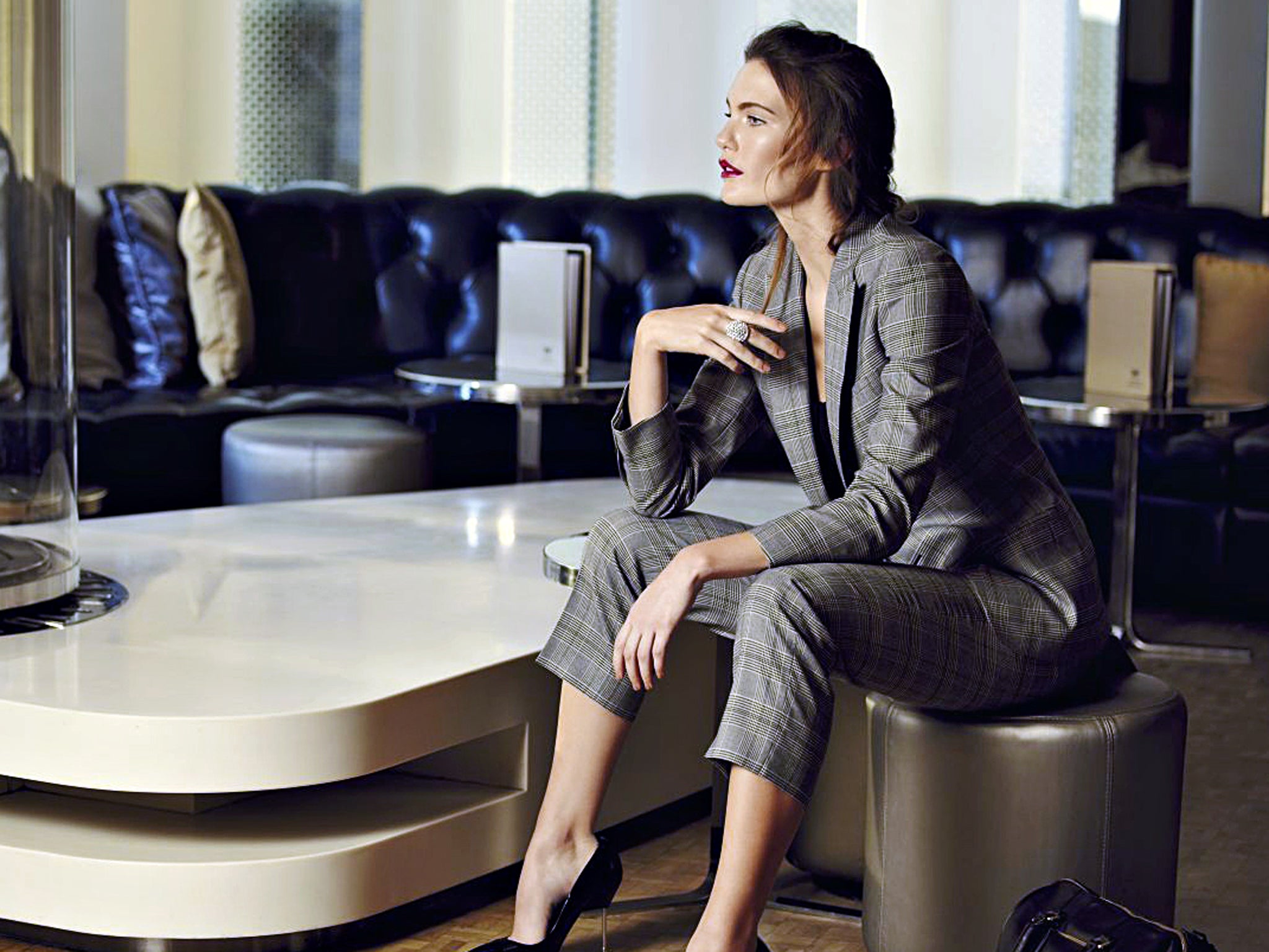3. Grey jacket £100, and trousers £50, both topshop.com; bustier top £29.99, Zara, as before; shoes as before; bag £300, Kurt Geiger, as before; ring £10, wallis.co.uk