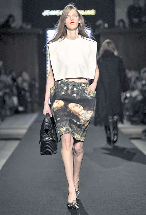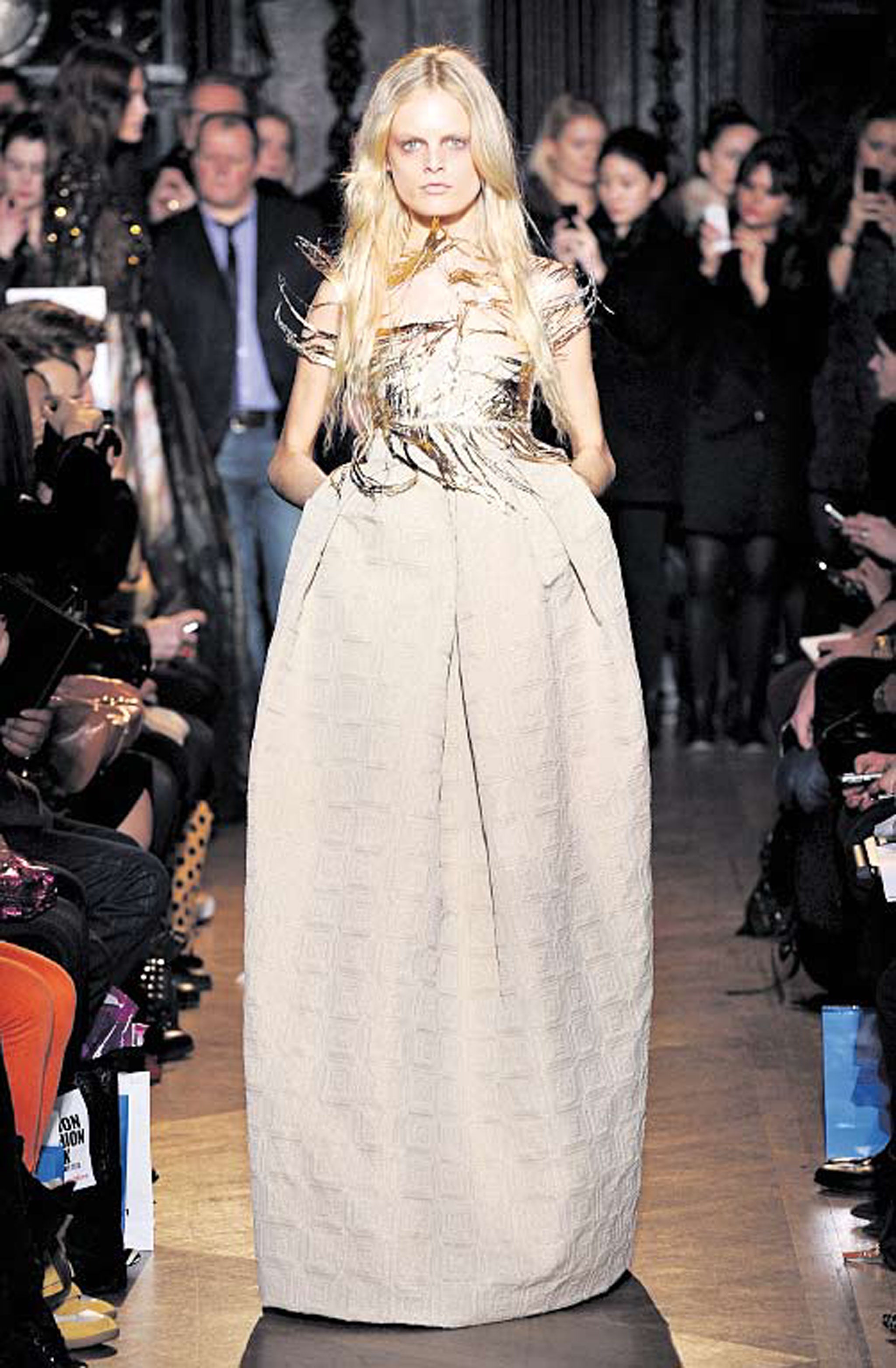 Ophelia stalked Giles Deacon's catwalk in London for autumn/winter 2013 too, in the guise of Kristen McMenamy wuthering through a medieval banqueting hall in pellucid satin to open and funereal black to close, book-ending a show of rich gold and red brocade gowns. “It does all kind of seem to share this similar vein of war-stricken maidens,” said designer Gareth Pugh. He was talking about the damsels in distress that populate Pre-Raphaelite art, not the year in fashion. But perhaps they're one and the same right now.