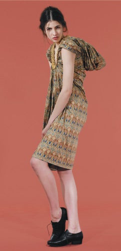 So far, so bold, and Marni's painterly prints gracing signature smocks are equally exuberant in flavour. For the Japanese designer Junya Watanabe, however, a more traditional floral print is the order of the day. This is not the first time that this highly innovative name has chosen to work with Liberty print, but it almost goes without saying that he handles it in anything but a conventional manner. Instead, a single piece of fabric is draped, pleated and wrapped around the body and then fastened to it by ropes of gold chain, bringing both the French haute-couture tradition and the rainbow decorative cloth favoured in African dress to mind.
