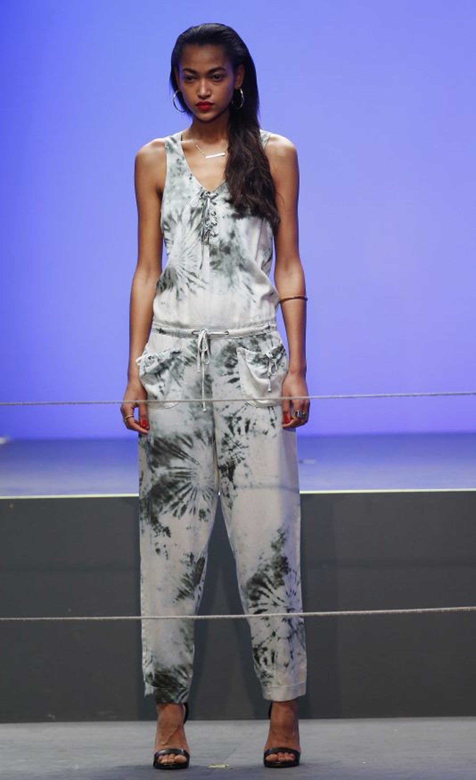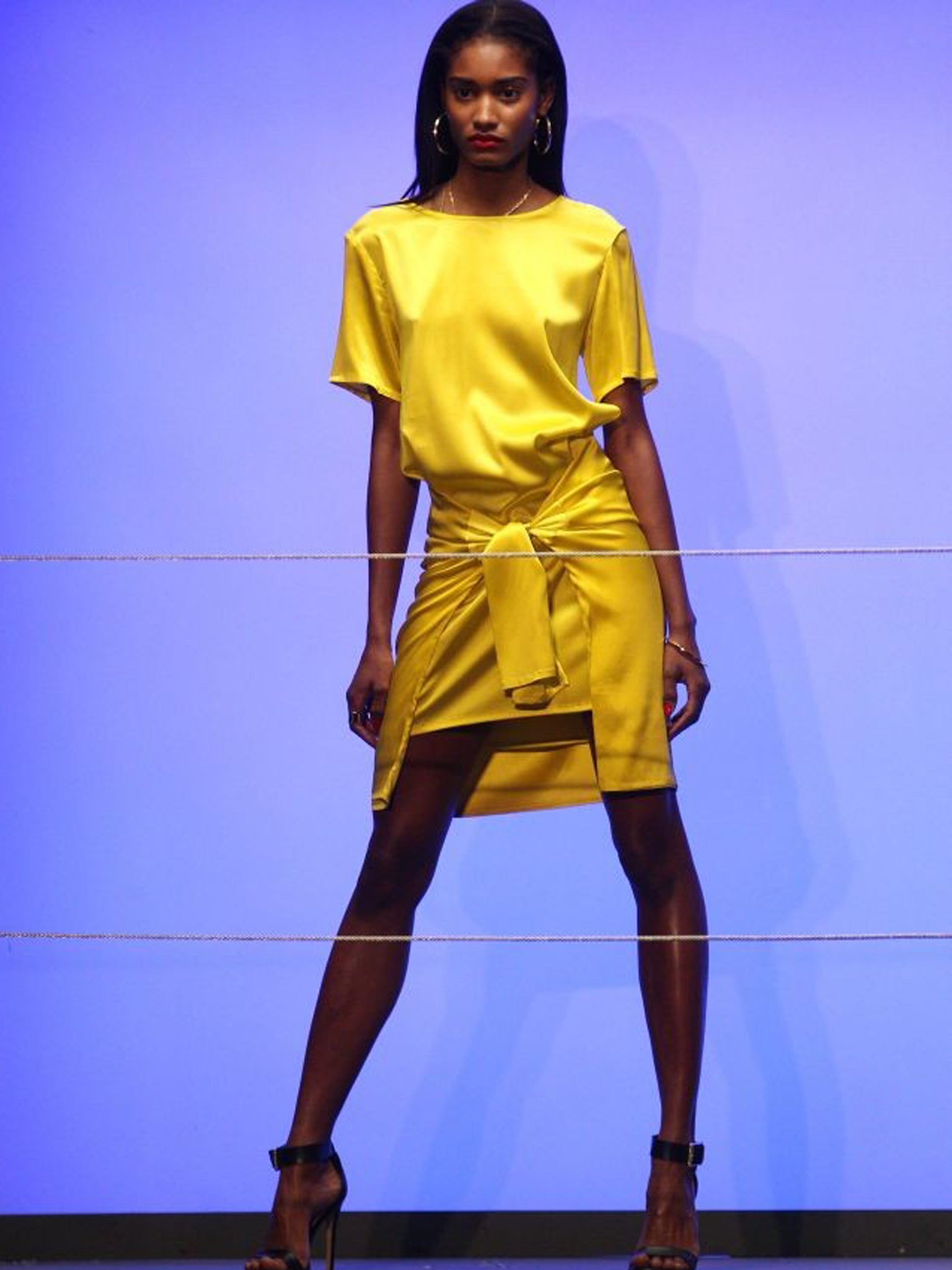 Models Cara Delevingne and Jourdan Dunn sat front row and Rihanna herself took a bow at the end. The clothes were urban in flavour, with crop tops, thigh-high slits and battered denim reflecting the tastes of the megastar that created it. It arrives in stores in early March.