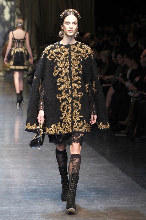 Dolce & Gabbana's show was a case in point – the label's first since the closure of their subsidiary D&G line last September. The incorporation into the mainline of its more commercial angle was interesting to see: their collection was nothing if not grandiose, inspired by the romanticism of the baroque era. Models wore sumptuous black wool capes and coats embroidered with thick golden threads redolent of the curlicues of classical picture frames. Full-skirted silk dresses burst with needlepoint tapestries, cherubs and still-life fruits, but Milan's most famous initials were present too.