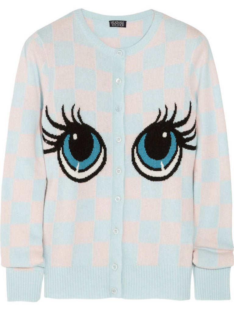Making eyes at someone will never be the same again with this cartoonish intarsia design set on a checkerboard background of candy hues.