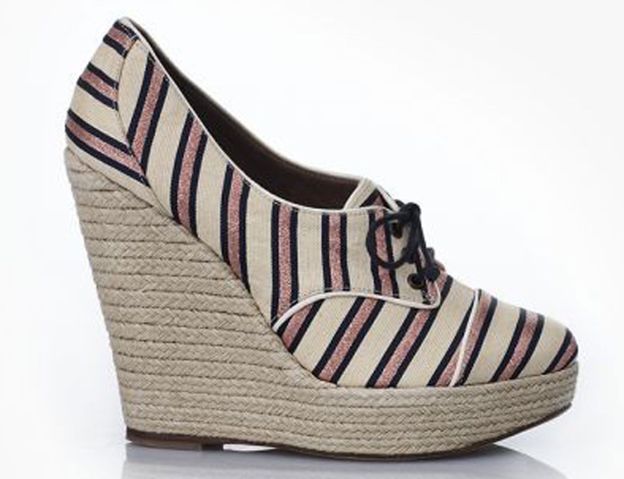 Question: what do wedges plus raffia equal? Answer: summer! Tabitha Simmons is a master of print and pattern on her heels, and these rustic red stripes strike the perfect laid-back summer mood. Channel Audrey Hepburn in Roman Holiday and pair them with a full skirt and a straw hat. A scooter is optional.