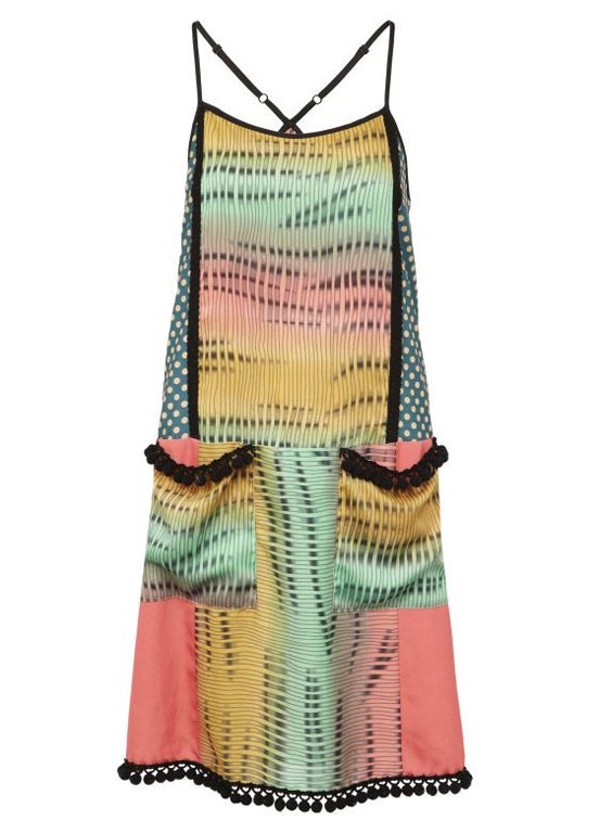 Ombré pastel panels layered with an optical illusion print and married with polka dots and pom poms would frighten many, but the simple shape makes it easy to wear.