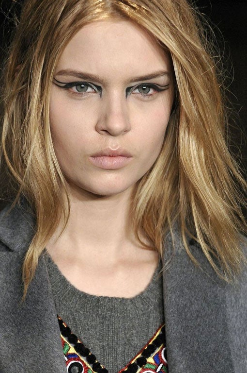 Stripes and geometries decorated eyelids at Prada and Altuzarra; tone down the look for everyday, but take inspiration from the cartoon colours at the former and dust on neon shades to give blocked, matte coverage. At the latter, double-pronged liner reached from the inner corner to the brow – try an unusual shade (such as Illamasqua's aubergine offering) and keep skin plain.