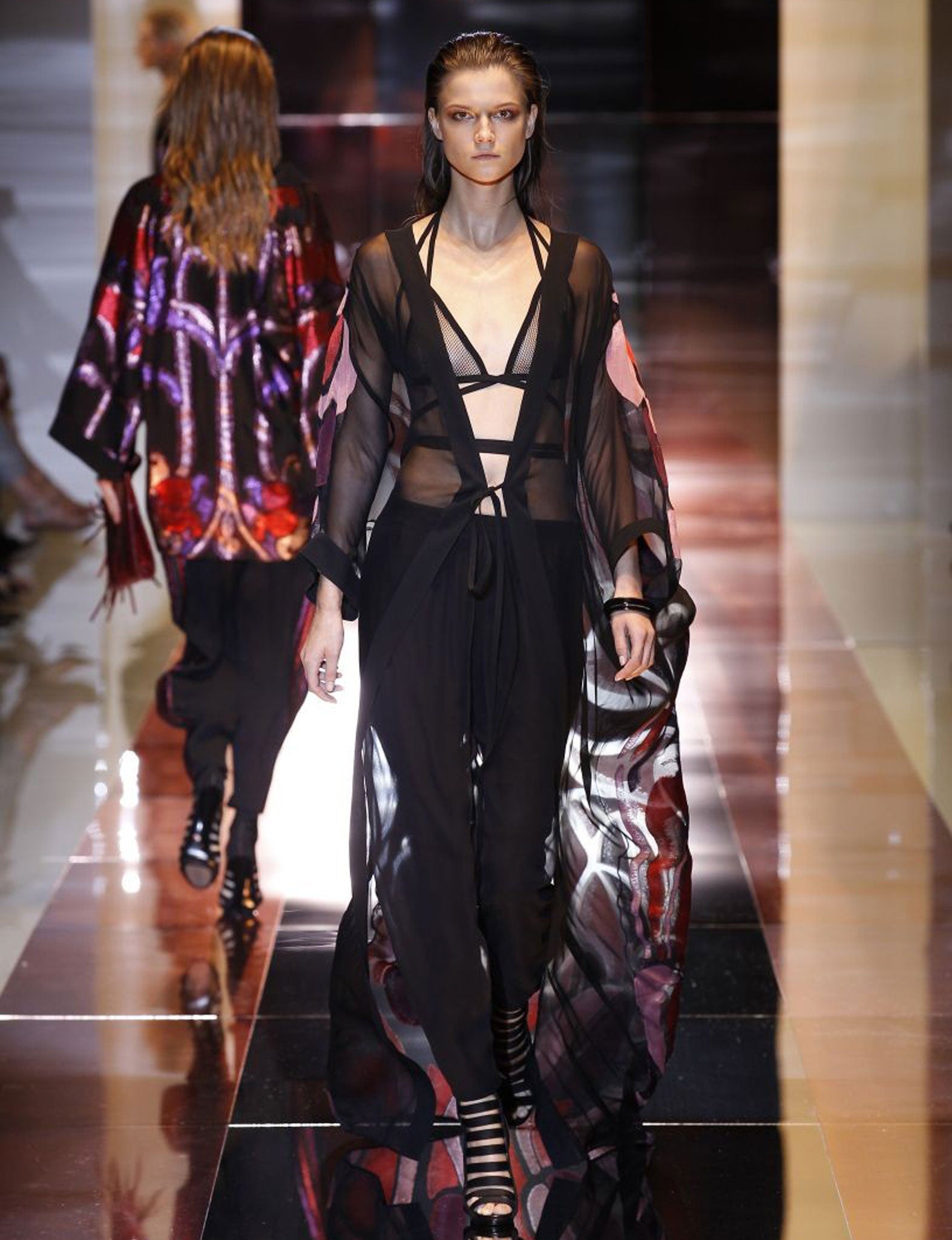 That sporty spice was also picked up by labels such as Gucci and Pucci, a rhyming couplet who both showed a take on sports vs sex. Frida Giannini's Gucci consisted of silky tracksuits and chiffon tunics whirled with Erte-inspired Art Nouveau-meets-Nagasaki patterns. Peter Dundas took a tougher approach, cinching jersey dresses with thick wrestling belts and beading marco-scale vertex into fishnet evening dresses that revealed more than they concealed. Both seemed to think it entirely plausible that women would take to the gym in 6in heels. That's go-faster, for fashion.