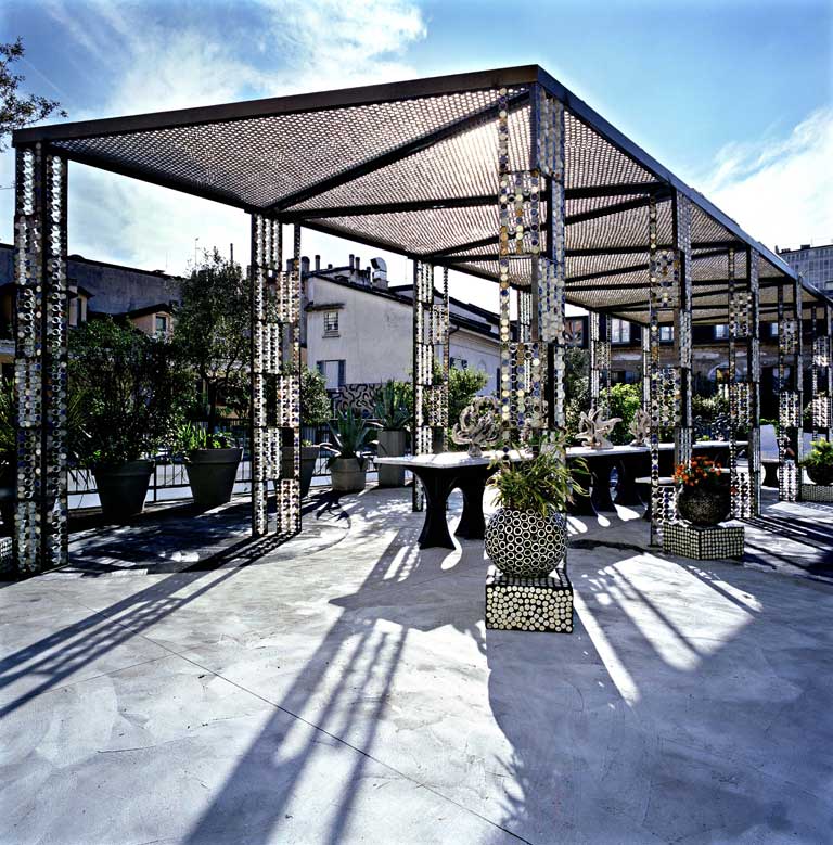 Ruhs' latest project, an installation for London's Wapping Project, which will take over the Docklands space during London Design Festival, is just as interactive. He intends to build a light fixture based around the idea of a ceramic forest. Standing in his studio in the south-west of Milan later that afternoon, we are surrounded by burnt and skeletal-looking glazed clay tubing, fired at around 1,000 degrees and then quickly shocked in sand to give them a distinct decayed look. At another end of the studio, his team are assembling an 11-metre-long aluminium bas-relief, which will also be lit from within. Visitors will be encouraged to sit in this ceramic forest, and to wander through a labyrinth constructed from sheets of wadded rubber, collected from old tyre tubes.