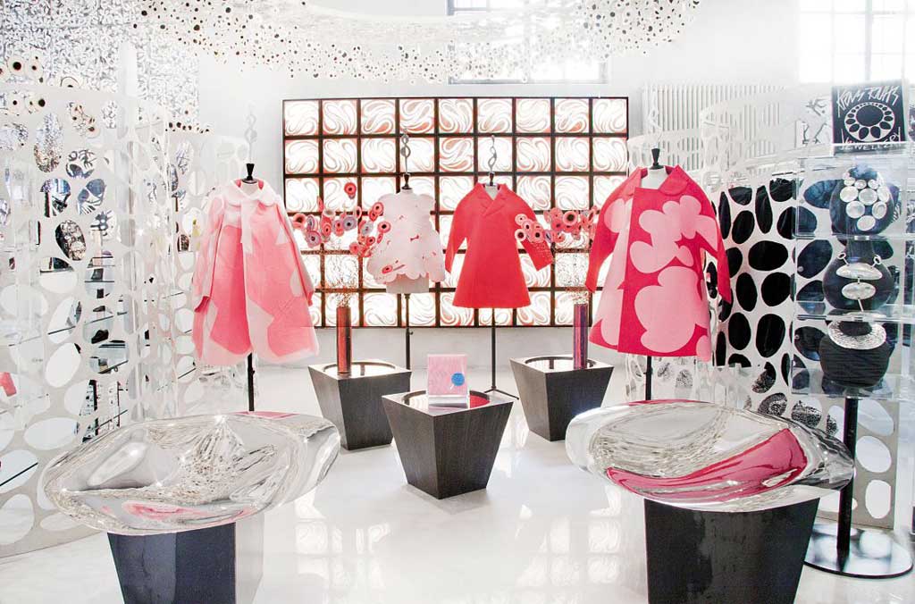 Ruhs' art is the linking feature between each facet of Corso Como – from frescoes to furniture and fixtures – and it is present in the very characterisation of the 10 Corso Como business. His graphic designs make up the logo, too: swirling, concentric loops that echo the rounded-ness of the address itself, and spread to a multitude of dots and splodges across the walls of the boutique, providing a perfectly pretty backdrop to garments from conceptual labels such as Azzedine Alaïa, Comme des Garçons and Gareth Pugh. "There are a lot of circles in 10 Corso Como," Ruhs observes.
