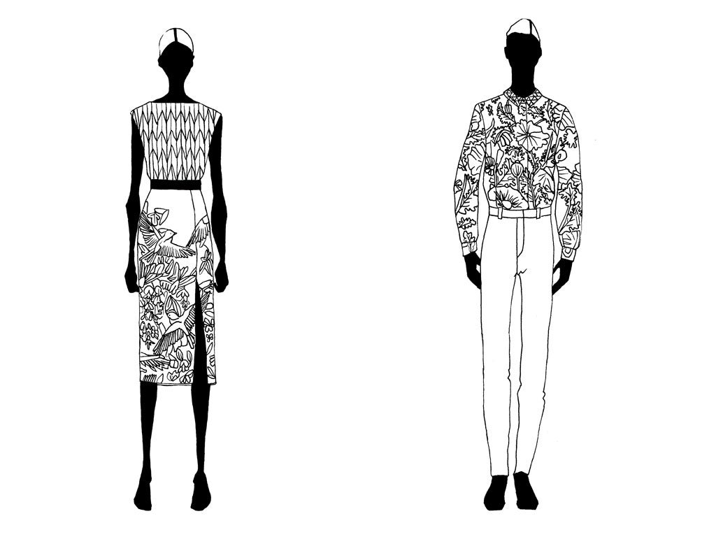 But otherwise, it is straight down to business. He has had a frenetic year, with the launch of a menswear collection during Fashion Week last February, an inter-seasonal women’s pre-collection that buyers have snapped up and the main womenswear show in September. Add to this the unveiling of an “Editions” line with the department store Debenhams in January, as well as a post within the Italian house Escada designing its Sport range and a collaboration with the stationery brand Smythson, which is using the bird prints from his autumn collection on a range of notebooks and diaries, and there is some sense of how sought after Saunders is. And he designed the staff uniforms at Sir Elton John’s Grey Goose Winter Ball last month, a ritzy affair to raise money for the Aids Foundation ahead of last week’s World Aids Day.