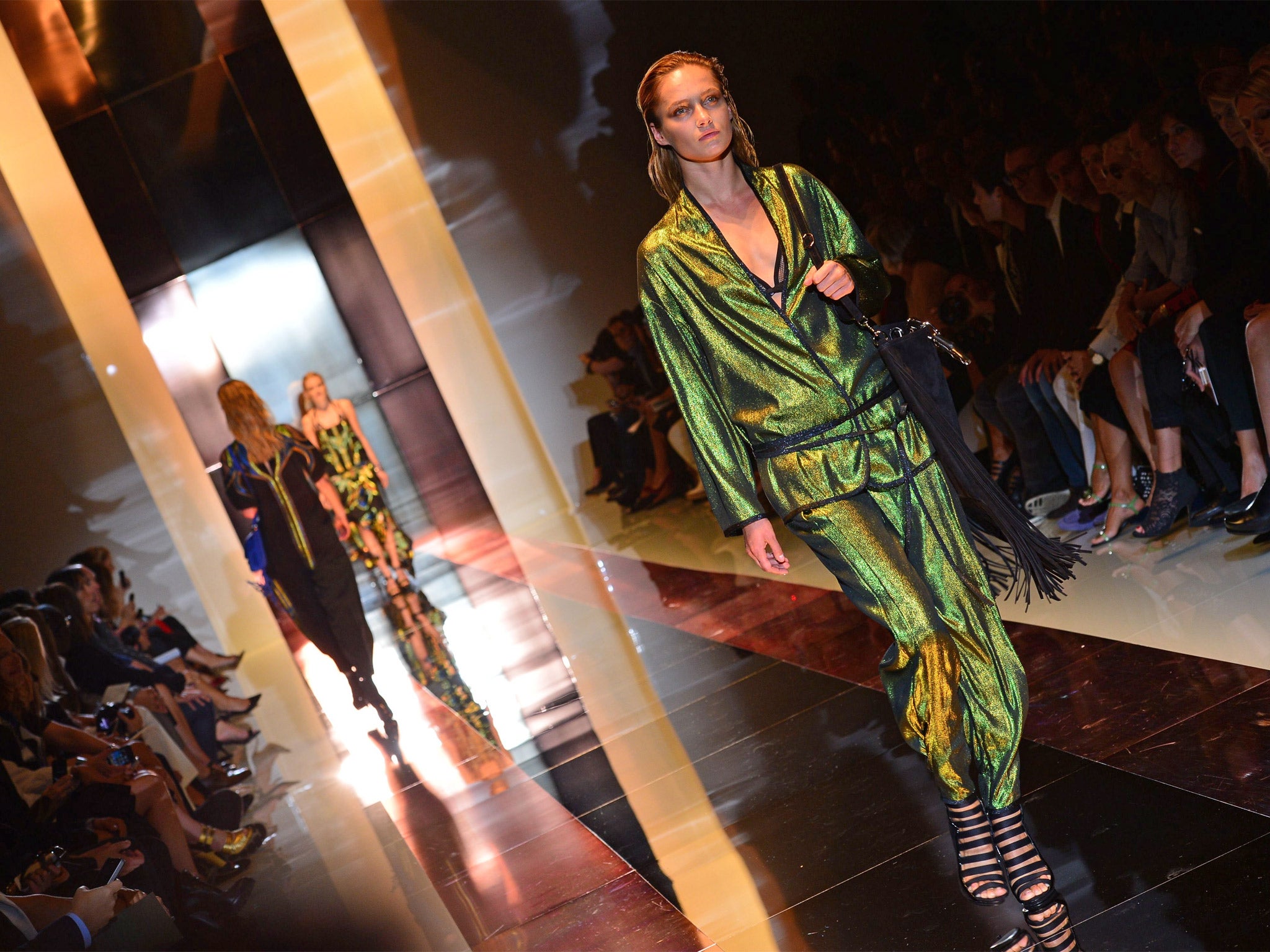 Nevertheless, regardless of the geography of New York versus Shanghai, both via a plush mirrored Milanese showroom, both these inspirations yield a similar mood overall: decadence, debauchery, generally the sort of stuff you can't do while you're pregnant. Maybe this was Giannini's big catwalk blow-out, her disco-hued oriental ode to the good-time girl. With the thigh-high splits, navel-grazing necklines and Araki-ish multistrapped underpinnings on show beneath transparent layers, there was a lot of body on show. The look was toned, taut and demanding, as well as sexy. Molto sexy. Can we say MILF? Probably. That's as much a part of Gucci's heritage as the horsebit. And they're both about getting back in the saddle.