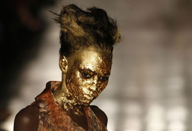 Earlier, at a packed show attended by the supermodels Twiggy and Alexa Chung, Matthew Williamson showed his trademark tribal knits and Aztec prints on mini dresses and raffia-trimmed coats, paired with bright wool slacks and motocross trousers.